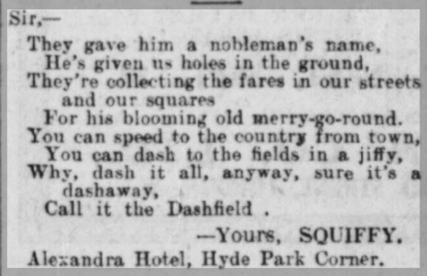 The Dashfield line has a certain ring to it, don’t you think? Meanwhile, the Sporting Times, casting about for a name, suggests “…the one that a fellow we know called it after he’d been delayed twenty minutes owing to a breakdown”. That would have quickly aged, of course, because, as we all know, the Northern line never breaks down today.